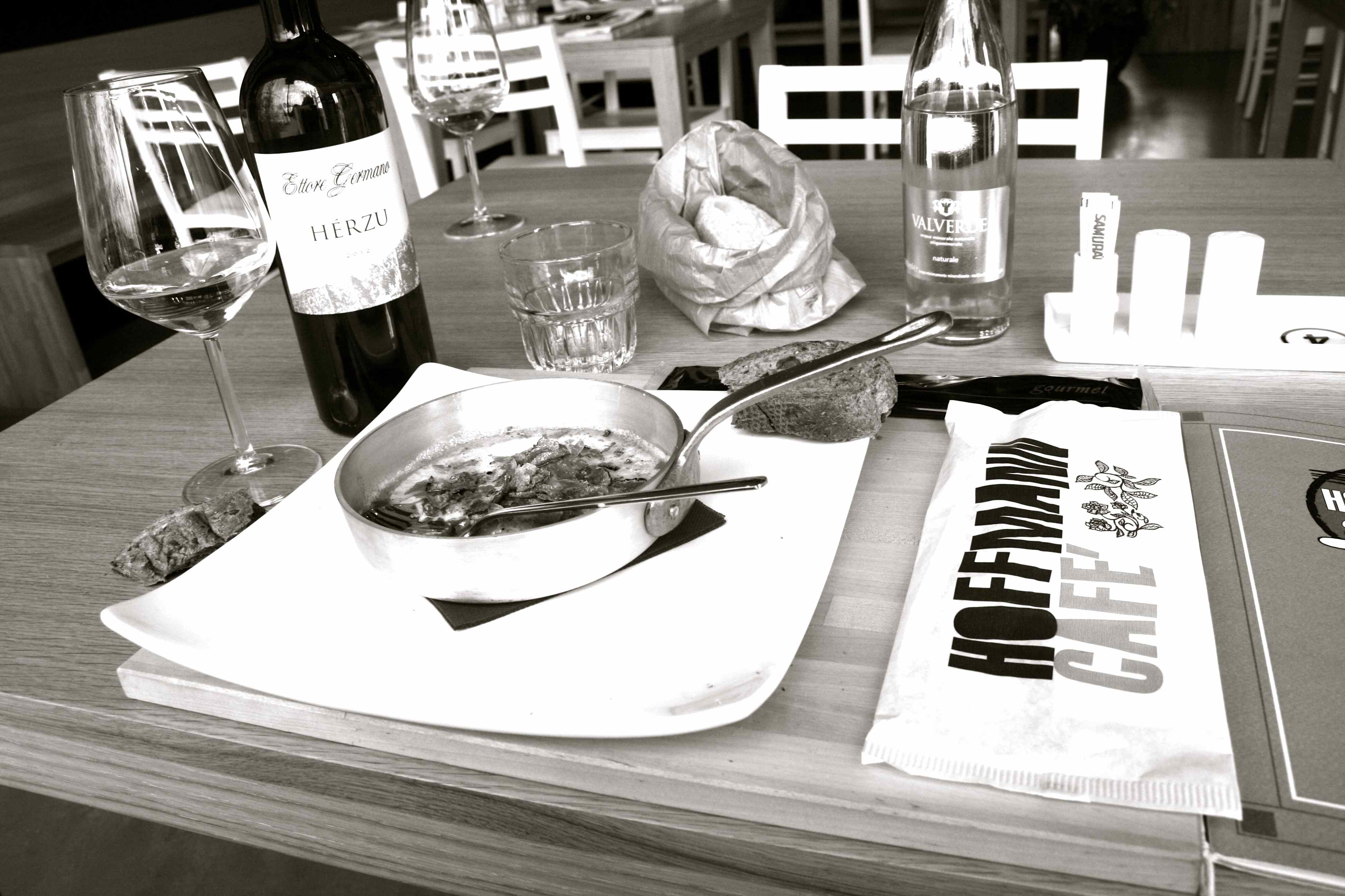 Il viaggio, intendo qualsiasi viaggio, non solo quelli nei paesi esotici, ha un fascino particolare. E’ il momento che più si avvicina al sogno, perché tutto ciò che ci circonda è nuovo e rappresenta un susseguirsi di emozioni. Anche la giornata di viaggio di lavoro ha il suo fascino, perché dietro l’angolo c’è sempre qualcosa da scovare, un piccolo casolare, un albero dalla forma insolita o semplicemente lo sguardo di una persona che ti aiuta a viaggiare con la fantasia (che tra l’altro costa meno di viaggiare in macchina). Quando arriva l’ora del pranzo si apre la roulette russa. C’è chi si affida a Tripadvisor, chi alle guide, chi chiama l’amico, e chi si lascia andare all’istinto. Questa volta ho scelto il posto per il mio pranzo semplicemente perché sapevo che sarei capitato bene, ma mi è andata meglio di quanto non mi aspettassi. Il locale è l’Hoffmann di Massimiliano e Gabriele Crivellaro, un piccolo bistrò nel paese di Villaverla tra Thiene e Vicenza. Un locale che nasce all’interno di un complesso nuovo ricavato dal recupero di una vecchia fonderia. Un luogo semplice nell’arredamento ma elegante e comunicativo dove ogni dettaglio non è lasciato al caso. Un locale diviso in un banco bar per la caffetteria, la parte dedicata ai cocktail con una snackeria d’autore, un angolo enoteca e il piccolo ristorantino. Un luogo dove si trova di tutto un po’ e tutto ben curato con selezioni attente e dense di passione. Un menù, il loro, fatto di poche portate ma con materie prime di gran livello e soluzioni sfiziose mai banali. Avevo già provato il mini hamburger accompagnato da uno shot di gin tonic stimolantissimo, oggi all’antipasto scelgo le uova al tegamino che vengono servite con un top di tartufo bianco, solo oggi, il primo della stagione, che mi tira sul il morale. Marco Sparacino in sala, sensibile e attento sommelier mi suggerisce il riesling di Ettore Germano che compie il suo lavoro magistralmente su questo piatto. Amedeo Baio, il cuoco, ragazzo giovane e attento mi propone poi delle conchiglie di pasta di Gragnano con cozze su uno specchio di salsa di fagioli e una grattatina di bottarga per farmi fare ritornare le sensazioni delle vacanze al mare.