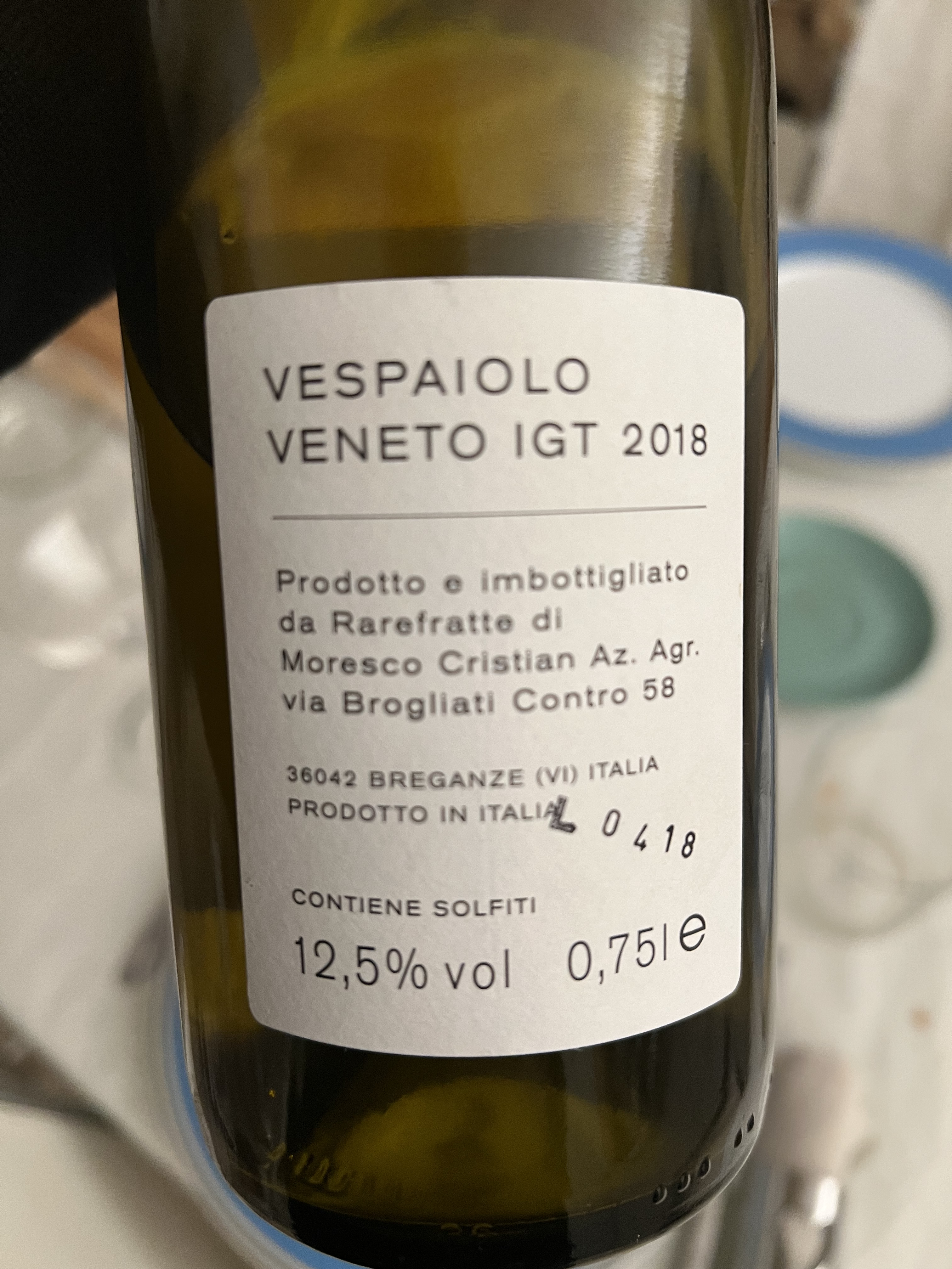 In questi suoli la Vespaiola si esprime al meglio capace di essere una nobile base spumante, dotata di grande freschezza e intensità, quanto il dolce torcolato. Nel mezzo, le sfumature, che appartengono ai grandi vini. Non sempre questo emerge, ma quando il vignaiolo è dotato si particolare sensibilità e visione il risultato è entusiasmante. Come questo Vespaiolo 2018 di Rarefratte di Cristian Moresco, un produttore che vive con intensità il territorio che gli ha dato i natali e con esso, dialoga nello spazio e nel tempo.